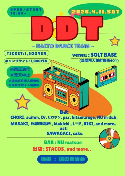 ※大東の野外イベント"DDT"でのドリンク出店です(出雲ビルでの営業はお休みです)